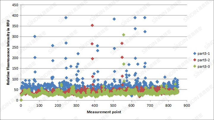 为了验证等离子清洗机的效果,测试人员使用等离子清洗机对玻璃盖板进行清洗实验。采用表面清洁度系统对玻璃盖板的清洁残留污染物含量程度评判,RFU值(Relative Fluorescence Units)表示清洁度的高低,RFU为相对荧光强度值,RFU值越大,表面的残留污染物含量也越高。