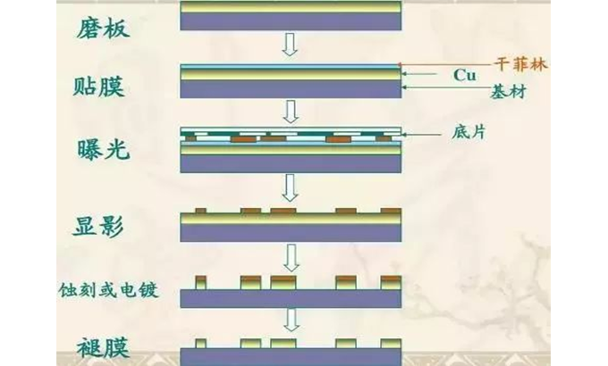 内层干膜是将内层线路图形转移到PCB板上的过程。内层干膜包括内层贴膜、曝光显影、内层蚀刻等多道工序。内层贴膜就是在铜板表面贴上一层特殊的感光膜,就是我们所说的干膜。这种膜遇光会固化,在板子上形成一道保护膜。曝光显影是将贴好膜的板进行曝光,透光的部分被固化,没透光的部分还是干膜。然后经过显影,褪掉没固化的干膜,将贴有固化保护膜的板进行蚀刻。再经过退膜处理,这时内层的线路图形就被转移到板子上了。其整个工艺流程如下图。