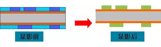 利用显影液(碳酸钠)的弱碱性将未经曝光的干膜/湿膜溶解冲洗掉,已曝光的部分保留。
