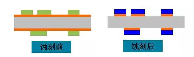 未经曝光的干膜/湿膜被显影液去除后会露出铜面,用酸性氯化铜将这部分露出的铜面溶解腐蚀掉,得到所需的线路。